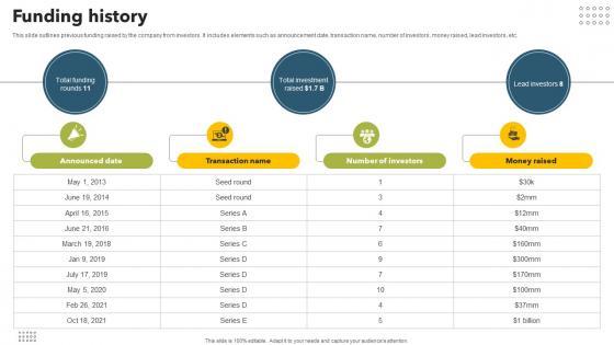 This slide outlines previous funding raised by the company from investors. It includes elements such as announcement date, transaction name, number of investors, money raised, lead investors, etc. Do you have an important presentation coming up Are you looking for something that will make your presentation stand out from the rest Look no further than Funding History Mobile Banking App Investor Funding Elevator Pitch Deck With our professional designs, you can trust that your presentation will pop and make delivering it a smooth process. And with Slidegeeks, you can trust that your presentation will be unique and memorable. So why wait Grab Funding History Mobile Banking App Investor Funding Elevator Pitch Deck today and make your presentation stand out from the rest This slide outlines previous funding raised by the company from investors. It includes elements such as announcement date, transaction name, number of investors, money raised, lead investors, etc.