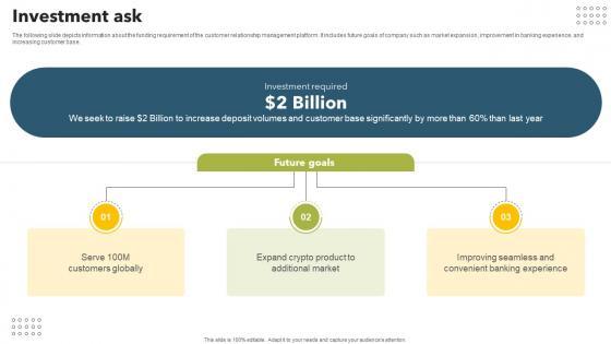 The following slide depicts information about the funding requirement of the customer relationship management platform. It includes future goals of company such as market expansion, improvement in banking experience, and increasing customer base. Find highly impressive Investment Ask Mobile Banking App Investor Funding Elevator Pitch Deck on Slidegeeks to deliver a meaningful presentation. You can save an ample amount of time using these presentation templates. No need to worry to prepare everything from scratch because Slidegeeks experts have already done a huge research and work for you. You need to download Investment Ask Mobile Banking App Investor Funding Elevator Pitch Deck for your upcoming presentation. All the presentation templates are 100 percent editable and you can change the color and personalize the content accordingly. Download now The following slide depicts information about the funding requirement of the customer relationship management platform. It includes future goals of company such as market expansion, improvement in banking experience, and increasing customer base.