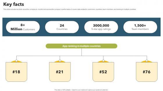 This slide includes key facts about the company to monitor and assess the companys performance. It covers data related to customers, countries, team members, and ranking in multiple countries. If your project calls for a presentation, then Slidegeeks is your go to partner because we have professionally designed, easy to edit templates that are perfect for any presentation. After downloading, you can easily edit Key Facts Mobile Banking App Investor Funding Elevator Pitch Deck and make the changes accordingly. You can rearrange slides or fill them with different images. Check out all the handy templates This slide includes key facts about the company to monitor and assess the companys performance. It covers data related to customers, countries, team members, and ranking in multiple countries.