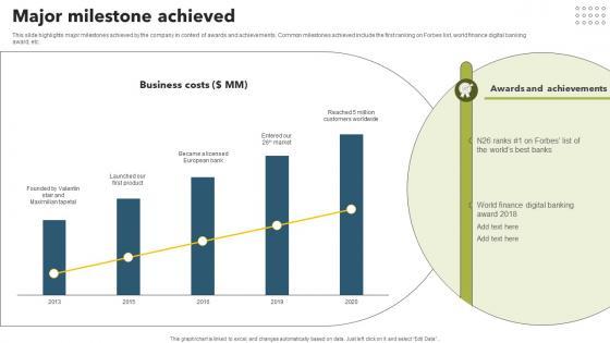 This slide highlights major milestones achieved by the company in context of awards and achievements. Common milestones achieved include the first ranking on Forbes list, world finance digital banking award, etc. If you are looking for a format to display your unique thoughts, then the professionally designed Major Milestone Achieved Mobile Banking App Investor Funding Elevator Pitch Deck is the one for you. You can use it as a Google Slides template or a PowerPoint template. Incorporate impressive visuals, symbols, images, and other charts. Modify or reorganize the text boxes as you desire. Experiment with shade schemes and font pairings. Alter, share or cooperate with other people on your work. Download Major Milestone Achieved Mobile Banking App Investor Funding Elevator Pitch Deck and find out how to give a successful presentation. Present a perfect display to your team and make your presentation unforgettable. This slide highlights major milestones achieved by the company in context of awards and achievements. Common milestones achieved include the first ranking on Forbes list, world finance digital banking award, etc.