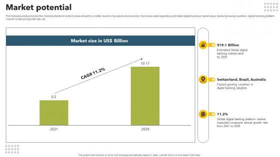 The following slide provides the market potential in order to plan ahead for a better launch of products and services. It provides data regarding estimated digital banking market value, fastest growing countries, digital banking platform market compound growth rate, etc. Are you in need of a template that can accommodate all of your creative concepts This one is crafted professionally and can be altered to fit any style. Use it with Google Slides or PowerPoint. Include striking photographs, symbols, depictions, and other visuals. Fill, move around, or remove text boxes as desired. Test out color palettes and font mixtures. Edit and save your work, or work with colleagues. Download Market Potential Mobile Banking App Investor Funding Elevator Pitch Deck and observe how to make your presentation outstanding. Give an impeccable presentation to your group and make your presentation unforgettable. The following slide provides the market potential in order to plan ahead for a better launch of products and services. It provides data regarding estimated digital banking market value, fastest growing countries, digital banking platform market compound growth rate, etc.