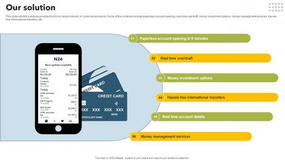 This slide exhibits solutions provided by firm to tackle industry or customer problems. Some of the solutions include paperless account opening, real time overdraft, money investment options, money management services, hassle free international transfers, etc. Make sure to capture your audiences attention in your business displays with our gratis customizable Our Solution Mobile Banking App Investor Funding Elevator Pitch Deck These are great for business strategies, office conferences, capital raising or task suggestions. If you desire to acquire more customers for your tech business and ensure they stay satisfied, create your own sales presentation with these plain slides. This slide exhibits solutions provided by firm to tackle industry or customer problems. Some of the solutions include paperless account opening, real time overdraft, money investment options, money management services, hassle free international transfers, etc.