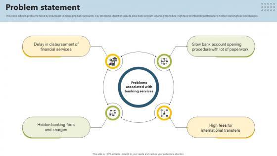 This slide exhibits problems faced by individuals in managing bank accounts. Key problems identified include slow bank account opening procedure, high fees for international transfers, hidden banking fees and charges. Formulating a presentation can take up a lot of effort and time, so the content and message should always be the primary focus. The visuals of the PowerPoint can enhance the presenters message, so our Problem Statement Mobile Banking App Investor Funding Elevator Pitch Deck was created to help save time. Instead of worrying about the design, the presenter can concentrate on the message while our designers work on creating the ideal templates for whatever situation is needed. Slidegeeks has experts for everything from amazing designs to valuable content, we have put everything into Problem Statement Mobile Banking App Investor Funding Elevator Pitch Deck This slide exhibits problems faced by individuals in managing bank accounts. Key problems identified include slow bank account opening procedure, high fees for international transfers, hidden banking fees and charges.