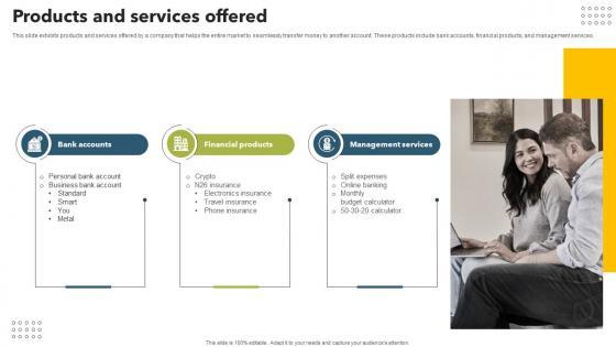 This slide exhibits products and services offered by a company that helps the entire market to seamlessly transfer money to another account. These products include bank accounts, financial products, and management services. Coming up with a presentation necessitates that the majority of the effort goes into the content and the message you intend to convey. The visuals of a PowerPoint presentation can only be effective if it supplements and supports the story that is being told. Keeping this in mind our experts created Products And Services Offered Mobile Banking App Investor Funding Elevator Pitch Deck to reduce the time that goes into designing the presentation. This way, you can concentrate on the message while our designers take care of providing you with the right template for the situation. This slide exhibits products and services offered by a company that helps the entire market to seamlessly transfer money to another account. These products include bank accounts, financial products, and management services.