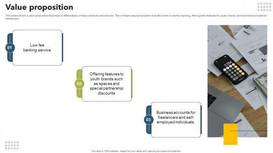 This slide exhibits a value proposition that helps to differentiate company products and services. The company value proposition includes no fee or low fee banking, offering extra features for youth brands, and business accounts for freelancers. Explore a selection of the finest Value Proposition Mobile Banking App Investor Funding Elevator Pitch Deck here. With a plethora of professionally designed and pre made slide templates, you can quickly and easily find the right one for your upcoming presentation. You can use our Value Proposition Mobile Banking App Investor Funding Elevator Pitch Deck to effectively convey your message to a wider audience. Slidegeeks has done a lot of research before preparing these presentation templates. The content can be personalized and the slides are highly editable. Grab templates today from Slidegeeks. This slide exhibits a value proposition that helps to differentiate company products and services. The company value proposition includes no fee or low fee banking, offering extra features for youth brands, and business accounts for freelancers.