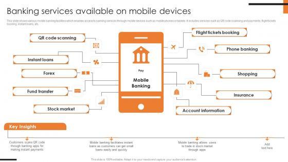 This slide shows various mobile banking facilities which enables access to banking services through mobile devices such as mobile phones or tablets. It includes services such as QR code scanning and payments, flight tickets booking, instant loans, etc. Create an editable Banking Services Available On Mobile Devices Ppt Show Visual Aids PDF that communicates your idea and engages your audience. Whether you are presenting a business or an educational presentation, pre designed presentation templates help save time. Banking Services Available On Mobile Devices Ppt Show Visual Aids PDF is highly customizable and very easy to edit, covering many different styles from creative to business presentations. Slidegeeks has creative team members who have crafted amazing templates. So, go and get them without any delay.