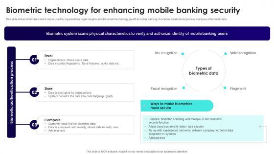 This slide shows information which can be used by organizations to get insights about biometric technology growth in mobile banking. It includes details about process and types of biometric data. Whether you have daily or monthly meetings, a brilliant presentation is necessary. Wireless Banking To Improve Biometric Technology For Enhancing Mobile Fin SS V can be your best option for delivering a presentation. Represent everything in detail using Wireless Banking To Improve Biometric Technology For Enhancing Mobile Fin SS V and make yourself stand out in meetings. The template is versatile and follows a structure that will cater to your requirements. All the templates prepared by Slidegeeks are easy to download and edit. Our research experts have taken care of the corporate themes as well. So, give it a try and see the results. This slide shows information which can be used by organizations to get insights about biometric technology growth in mobile banking. It includes details about process and types of biometric data.