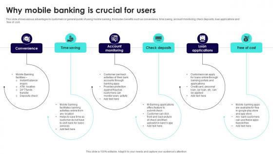 This slide shows various advantages to customers or general public of using mobile banking. It includes benefits such as convenience, time saving, account monitoring, check deposits, loan applications and free of cost. Slidegeeks has constructed Why Mobile Banking Is Crucial For Users Ppt Professional Images PDF after conducting extensive research and examination. These presentation templates are constantly being generated and modified based on user preferences and critiques from editors. Here, you will find the most attractive templates for a range of purposes while taking into account ratings and remarks from users regarding the content. This is an excellent jumping off point to explore our content and will give new users an insight into our top notch PowerPoint Templates.