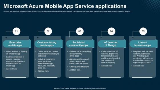 The given slide depicts the application areas of Microsoft Azure service provider for efficient mobile cloud computing. It includes enterprise mobile apps, customer-facing mobile apps, social and community apps, etc. The Microsoft Azure Mobile App Service Applications Application Areas Of Mobile Cloud Computing is a compilation of the most recent design trends as a series of slides. It is suitable for any subject or industry presentation, containing attractive visuals and photo spots for businesses to clearly express their messages. This template contains a variety of slides for the user to input data, such as structures to contrast two elements, bullet points, and slides for written information. Slidegeeks is prepared to create an impression. The given slide depicts the application areas of Microsoft Azure service provider for efficient mobile cloud computing. It includes enterprise mobile apps, customer-facing mobile apps, social and community apps, etc.