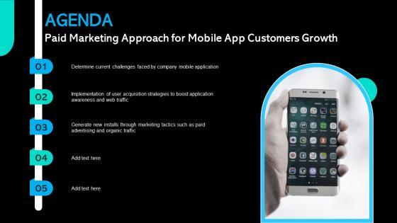 Boost your pitch with our creative Agenda Paid Marketing Approach For Mobile App Customers Growth Download Pdf Deliver an awe-inspiring pitch that will mesmerize everyone. Using these presentation templates you will surely catch everyones attention. You can browse the ppts collection on our website. We have researchers who are experts at creating the right content for the templates. So you do not have to invest time in any additional work. Just grab the template now and use them. Our Agenda Paid Marketing Approach For Mobile App Customers Growth Download Pdf are topically designed to provide an attractive backdrop to any subject. Use them to look like a presentation pro.