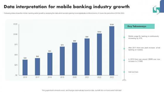 Following slides shows the mobile banking sector growth by analyzing the data which assist in gaining more digitalization in the economy. It covers the period from 2016 to 2023.Pitch your topic with ease and precision using this Data Interpretation For Mobile Banking Industry Growth Template Pdf This layout presents information on Banking Continuously, Banking Mobiles, Key Takeaways It is also available for immediate download and adjustment. So, changes can be made in the color, design, graphics or any other component to create a unique layout. Following slides shows the mobile banking sector growth by analyzing the data which assist in gaining more digitalization in the economy. It covers the period from 2016 to 2023.