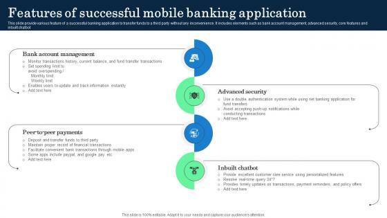 This slide provide various feature of a successful banking application to transfer funds to a third party without any inconvenience. It includes elements such as bank account management, advanced security, core features and inbuilt chatbot. Welcome to our selection of the Features Of Successful Mobile Banking Application Incorporating Banking Operational Growth. These are designed to help you showcase your creativity and bring your sphere to life. Planning and Innovation are essential for any business that is just starting out. This collection contains the designs that you need for your everyday presentations. All of our PowerPoints are 100Percent editable, so you can customize them to suit your needs. This multi-purpose template can be used in various situations. Grab these presentation templates today. This slide provide various feature of a successful banking application to transfer funds to a third party without any inconvenience. It includes elements such as bank account management, advanced security, core features and inbuilt chatbot