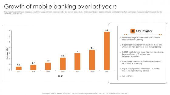 This slide shows continuous increase in adoption or usage of mobile banking over the few years. It also includes details regarding key reasons for rise in mobile banking which are increase in usage smartphones, user friendly interfaces, Covid -19, etc.The best PPT templates are a great way to save time, energy, and resources. Slidegeeks have 100Precent editable powerpoint slides making them incredibly versatile. With these quality presentation templates, you can create a captivating and memorable presentation by combining visually appealing slides and effectively communicating your message. Download Growth Of Mobile Banking Over Last Years Comprehensive Smartphone Banking Inspiration Pdf from Slidegeeks and deliver a wonderful presentation. This slide shows continuous increase in adoption or usage of mobile banking over the few years. It also includes details regarding key reasons for rise in mobile banking which are increase in usage smartphones, user friendly interfaces, Covid 19, etc.