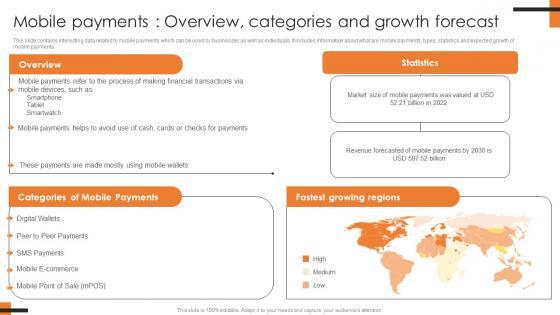This slide contains interesting data related to mobile payments which can be used by businesses as well as individuals. It includes information about what are mobile payments, types, statistics and expected growth of mobile payments. If your project calls for a presentation, then Slidegeeks is your go to partner because we have professionally designed, easy to edit templates that are perfect for any presentation. After downloading, you can easily edit Mobile Payments Overview Categories And Growth Forecast Ppt Ideas Model PDF and make the changes accordingly. You can rearrange slides or fill them with different images. Check out all the handy templates.