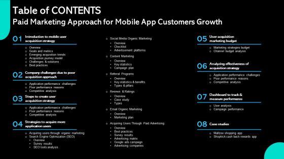 If your project calls for a presentation, then Slidegeeks is your go-to partner because we have professionally designed, easy-to-edit templates that are perfect for any presentation. After downloading, you can easily edit Table Of Contents Paid Marketing Approach For Mobile App Customers Growth Demonstration Pdf and make the changes accordingly. You can rearrange slides or fill them with different images. Check out all the handy templates Our Table Of Contents Paid Marketing Approach For Mobile App Customers Growth Demonstration Pdf are topically designed to provide an attractive backdrop to any subject. Use them to look like a presentation pro.