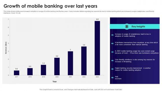 This slide shows continuous increase in adoption or usage of mobile banking over the few years. It also includes details regarding key reasons for rise in mobile banking which are increase in usage smartphones, user friendly interfaces, Covid -19, etc. Here you can discover an assortment of the finest PowerPoint and Google Slides templates. With these templates, you can create presentations for a variety of purposes while simultaneously providing your audience with an eye-catching visual experience. Download Wireless Banking To Improve Growth Of Mobile Banking Over Last Years Fin SS V to deliver an impeccable presentation. These templates will make your job of preparing presentations much quicker, yet still, maintain a high level of quality. Slidegeeks has experienced researchers who prepare these templates and write high-quality content for you. Later on, you can personalize the content by editing the Wireless Banking To Improve Growth Of Mobile Banking Over Last Years Fin SS V. This slide shows continuous increase in adoption or usage of mobile banking over the few years. It also includes details regarding key reasons for rise in mobile banking which are increase in usage smartphones, user friendly interfaces, Covid -19, etc.