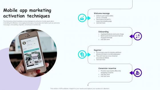 The following slide illustrates some strategies to enhance mobile application marketing for effective messaging techniques. It includes elements such as welcome message, onboarding, register, conversion incentive etc. Coming up with a presentation necessitates that the majority of the effort goes into the content and the message you intend to convey. The visuals of a PowerPoint presentation can only be effective if it supplements and supports the story that is being told. Keeping this in mind our experts created Mobile App Marketing Activation Leveraging Mobile Marketing Strategies Professional Pdf to reduce the time that goes into designing the presentation. This way, you can concentrate on the message while our designers take care of providing you with the right template for the situation. The following slide illustrates some strategies to enhance mobile application marketing for effective messaging techniques. It includes elements such as welcome message, onboarding, register, conversion incentive etc.