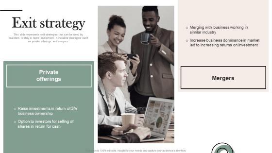 This slide represents exit strategies that can be used by investors to stay or leave investment. it includes strategies such as private offerings and mergers. Welcome to our selection of the Exit Strategy Mobile Solution Company Investor Fund Raising Pitch Deck Mockup Pdf. These are designed to help you showcase your creativity and bring your sphere to life. Planning and Innovation are essential for any business that is just starting out. This collection contains the designs that you need for your everyday presentations. All of our PowerPoints are 100 percent editable, so you can customize them to suit your needs. This multi purpose template can be used in various situations. Grab these presentation templates today This slide represents exit strategies that can be used by investors to stay or leave investment. it includes strategies such as private offerings and mergers.