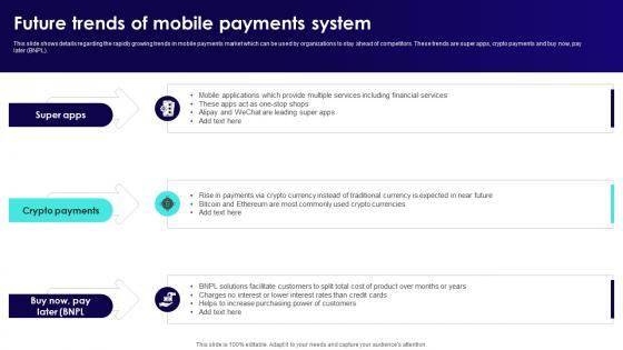 This slide shows details regarding the rapidly growing trends in mobile payments market which can be used by organizations to stay ahead of competitors. These trends are super apps, crypto payments and buy now, pay later BNPL. From laying roadmaps to briefing everything in detail, our templates are perfect for you. You can set the stage with your presentation slides. All you have to do is download these easy to edit and customizable templates. Future Trends Of Mobile Payments System Ppt Icon Example Introduction PDF will help you deliver an outstanding performance that everyone would remember and praise you for. Do download this presentation today.