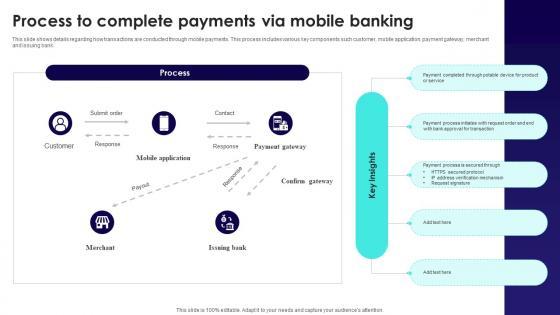 This slide shows details regarding how transactions are conducted through mobile payments. This process includes various key components such customer, mobile application, payment gateway, merchant and issuing bank. Make sure to capture your audiences attention in your business displays with our gratis customizable Wireless Banking To Improve Process To Complete Payments Via Mobile Banking Fin SS V. These are great for business strategies, office conferences, capital raising or task suggestions. If you desire to acquire more customers for your tech business and ensure they stay satisfied, create your own sales presentation with these plain slides. This slide shows details regarding how transactions are conducted through mobile payments. This process includes various key components such customer, mobile application, payment gateway, merchant and issuing bank.