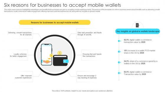 This slide covers reasons highlight the advantages and benefits that businesses can gain by accepting mobile wallet payments. The purpose of this template is to inform business owners about benefits such as delivering smooth transactions, loyalty schemes for better engagement, offering improved customer experiences, etc.along with key insights on global e-wallet. Are you in need of a template that can accommodate all of your creative concepts This one is crafted professionally and can be altered to fit any style. Use it with Google Slides or PowerPoint. Include striking photographs, symbols, depictions, and other visuals. Fill, move around, or remove text boxes as desired. Test out color palettes and font mixtures. Edit and save your work, or work with colleagues. Download Mastering Blockchain Wallets Six Reasons For Businesses To Accept Mobile Wallets BCT SS V and observe how to make your presentation outstanding. Give an impeccable presentation to your group and make your presentation unforgettable. This slide covers reasons highlight the advantages and benefits that businesses can gain by accepting mobile wallet payments. The purpose of this template is to inform business owners about benefits such as delivering smooth transactions, loyalty schemes for better engagement, offering improved customer experiences, etc.along with key insights on global e-wallet.
