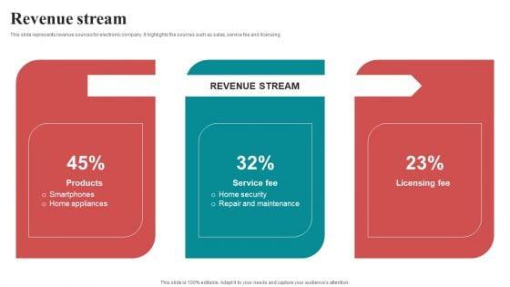 This slide represents revenue sources for electronic company. It highlights the sources such as sales, service fee and licensing. Are you searching for a Revenue Stream Mobile Electronics Fund Raising Pitch Deck Mockup PDF that is uncluttered, straightforward, and original Its easy to edit, and you can change the colors to suit your personal or business branding. For a presentation that expresses how much effort you have put in, this template is ideal With all of its features, including tables, diagrams, statistics, and lists, its perfect for a business plan presentation. Make your ideas more appealing with these professional slides. Download Revenue Stream Mobile Electronics Fund Raising Pitch Deck Mockup PDF from Slidegeeks today.