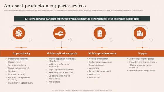 This slide covers the offering of the services after product launch provided by the company to the clients such as app monitoring, mobile application upgrade, mobile app enhancement and support services Here you can discover an assortment of the finest PowerPoint and Google Slides templates. With these templates, you can create presentations for a variety of purposes while simultaneously providing your audience with an eye catching visual experience. Download App Post Production Support Mobile App Development And Advertising Service Rules Pdf to deliver an impeccable presentation. These templates will make your job of preparing presentations much quicker, yet still, maintain a high level of quality. Slidegeeks has experienced researchers who prepare these templates and write high quality content for you. Later on, you can personalize the content by editing the App Post Production Support Mobile App Development And Advertising Service Rules Pdf. This slide covers the offering of the services after product launch provided by the company to the clients such as app monitoring, mobile application upgrade, mobile app enhancement and support services