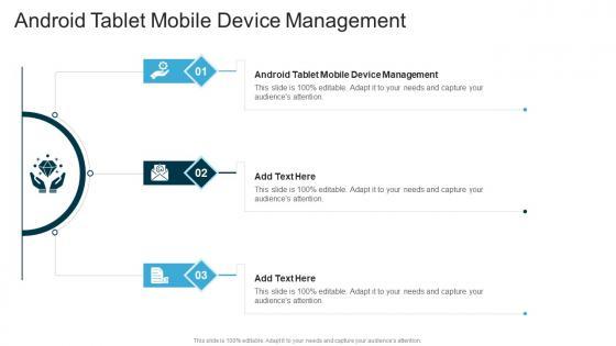 Introducing our well designed Android Tablet Mobile Device Management In Powerpoint And Google Slides Cpb. This PowerPoint design presents information on topics like Android Tablet Mobile Device Management. As it is predesigned it helps boost your confidence level. It also makes you a better presenter because of its high quality content and graphics. This PPT layout can be downloaded and used in different formats like PDF, PNG, and JPG. Not only this, it is available in both Standard Screen and Widescreen aspect ratios for your convenience. Therefore, click on the download button now to persuade and impress your audience. Our Android Tablet Mobile Device Management In Powerpoint And Google Slides Cpb are topically designed to provide an attractive backdrop to any subject. Use them to look like a presentation pro.