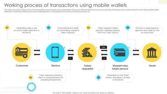 This slide covers step-by-step overview of how transactions are conducted using mobile wallets. The purpose of this template is to provide users about the underlying process and transaction flow when utilizing digital wallets starting from cardholders adding visa account to wallet application, connecting device to send account loading requests, etc. Slidegeeks has constructed Mastering Blockchain Wallets Working Process Of Transactions Using Mobile Wallets BCT SS V after conducting extensive research and examination. These presentation templates are constantly being generated and modified based on user preferences and critiques from editors. Here, you will find the most attractive templates for a range of purposes while taking into account ratings and remarks from users regarding the content. This is an excellent jumping-off point to explore our content and will give new users an insight into our top-notch PowerPoint Templates. This slide covers step-by-step overview of how transactions are conducted using mobile wallets. The purpose of this template is to provide users about the underlying process and transaction flow when utilizing digital wallets starting from cardholders adding visa account to wallet application, connecting device to send account loading requests, etc.