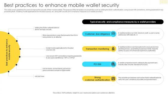 This slide covers guidelines for users to improve the security of their mobile wallets. The purpose of this template is to provide tips such as adding two factor authentication, using secure Wifi connections, storing passwords in way preventing theft, installing mobile applications from trusted sources, etc. along with security and compliance measures by E-wallets providers. There are so many reasons you need a Mastering Blockchain Wallets Best Practices To Enhance Mobile Wallet Security BCT SS V. The first reason is you can not spend time making everything from scratch, Thus, Slidegeeks has made presentation templates for you too. You can easily download these templates from our website easily. This slide covers guidelines for users to improve the security of their mobile wallets. The purpose of this template is to provide tips such as adding two factor authentication, using secure Wifi connections, storing passwords in way preventing theft, installing mobile applications from trusted sources, etc. along with security and compliance measures by E-wallets providers.