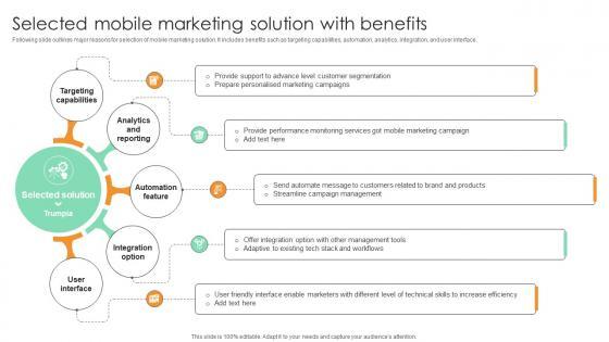 Following slide outlines major reasons for selection of mobile marketing solution. It includes benefits such as targeting capabilities, automation, analytics, integration, and user interface. Here you can discover an assortment of the finest PowerPoint and Google Slides templates. With these templates, you can create presentations for a variety of purposes while simultaneously providing your audience with an eye-catching visual experience. Download Selected Mobile Marketing Solution With Benefits Comprehensive Guide For Marketing Technology to deliver an impeccable presentation. These templates will make your job of preparing presentations much quicker, yet still, maintain a high level of quality. Slidegeeks has experienced researchers who prepare these templates and write high-quality content for you. Later on, you can personalize the content by editing the Selected Mobile Marketing Solution With Benefits Comprehensive Guide For Marketing Technology. Following slide outlines major reasons for selection of mobile marketing solution. It includes benefits such as targeting capabilities, automation, analytics, integration, and user interface.