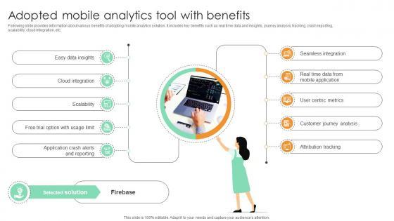 Following slide provides information about various benefits of adopting mobile analytics solution. It includes key benefits such as real time data and insights, journey analysis, tracking, crash reporting,scalability, cloud integration, etc.Create an editable Adopted Mobile Analytics Tool With Benefits Comprehensive Guide For Marketing Technology that communicates your idea and engages your audience. Whether you are presenting a business or an educational presentation, pre-designed presentation templates help save time. Adopted Mobile Analytics Tool With Benefits Comprehensive Guide For Marketing Technology is highly customizable and very easy to edit, covering many different styles from creative to business presentations. Slidegeeks has creative team members who have crafted amazing templates. So, go and get them without any delay. Following slide provides information about various benefits of adopting mobile analytics solution. It includes key benefits such as real time data and insights, journey analysis, tracking, crash reporting,scalability, cloud integration, etc.