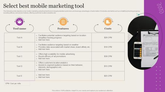 The following slide depicts some mobile marketing advertisement tools to target potential customers and leverage advantages of automation. It includes elements such as simplifying tracking progress, boosting efficacy and ad promotions, offering customer location analytics etc. Slidegeeks is one of the best resources for PowerPoint templates. You can download easily and regulate Select Best Mobile Marketing Tool Leveraging Mobile Marketing Strategies Sample Pdf for your personal presentations from our wonderful collection. A few clicks is all it takes to discover and get the most relevant and appropriate templates. Use our Templates to add a unique zing and appeal to your presentation and meetings. All the slides are easy to edit and you can use them even for advertisement purposes. The following slide depicts some mobile marketing advertisement tools to target potential customers and leverage advantages of automation. It includes elements such as simplifying tracking progress, boosting efficacy and ad promotions, offering customer location analytics etc.