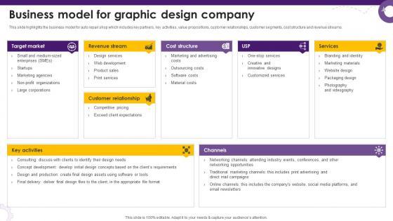 This slide highlights the business model for auto repair shop which includes key partners, key activities, value propositions, customer relationships, customer segments, cost structure and revenue streams. Slidegeeks is one of the best resources for PowerPoint templates. You can download easily and regulate Creative Agency Business Plan Business Model For Graphic Design Company BP SS V for your personal presentations from our wonderful collection. A few clicks is all it takes to discover and get the most relevant and appropriate templates. Use our Templates to add a unique zing and appeal to your presentation and meetings. All the slides are easy to edit and you can use them even for advertisement purposes. This slide highlights the business model for auto repair shop which includes key partners, key activities, value propositions, customer relationships, customer segments, cost structure and revenue streams.
