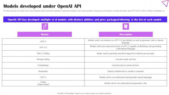 This slide showcases key models which were developed by OpenAI powered by Application Programming Interface to ease routine operations of businesses and developers. It provides information about GPT-4, GPT-3.5, DALL-E, Whisper, Embeddings, etc. Coming up with a presentation necessitates that the majority of the effort goes into the content and the message you intend to convey. The visuals of a PowerPoint presentation can only be effective if it supplements and supports the story that is being told. Keeping this in mind our experts created Models Developed Under OpenAI API Creative Applications For Open AI Microsoft Pdf to reduce the time that goes into designing the presentation. This way, you can concentrate on the message while our designers take care of providing you with the right template for the situation. This slide showcases key models which were developed by OpenAI powered by Application Programming Interface to ease routine operations of businesses and developers. It provides information about GPT-4, GPT-3.5, DALL-E, Whisper, Embeddings, etc.