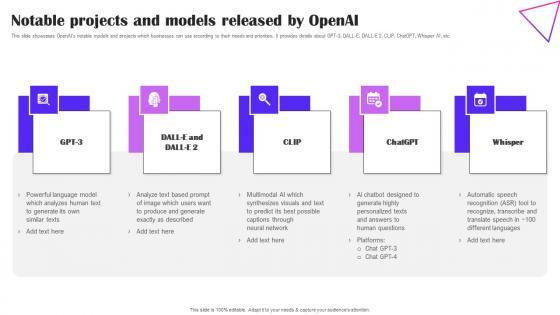 This slide showcases OpenAIs notable models and projects which businesses can use according to their needs and priorities. It provides details about GPT-3, DALL-E, DALL-E 2, CLIP, ChatGPT, Whisper AI, etc. This Notable Projects And Models Released By OpenAI Creative Applications For Open AI Rules Pdf is perfect for any presentation, be it in front of clients or colleagues. It is a versatile and stylish solution for organizing your meetings. The Notable Projects And Models Released By OpenAI Creative Applications For Open AI Rules Pdf features a modern design for your presentation meetings. The adjustable and customizable slides provide unlimited possibilities for acing up your presentation. Slidegeeks has done all the homework before launching the product for you. So, do not wait, grab the presentation templates today This slide showcases OpenAIs notable models and projects which businesses can use according to their needs and priorities. It provides details about GPT-3, DALL-E, DALL-E 2, CLIP, ChatGPT, Whisper AI, etc.