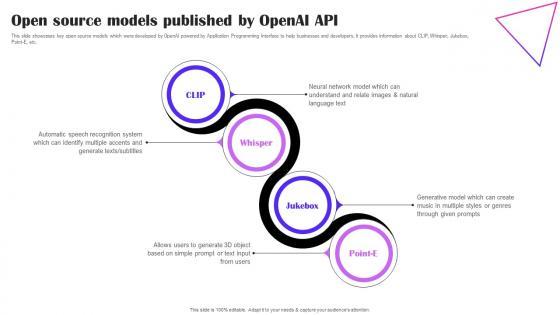 This slide showcases key open source models which were developed by OpenAI powered by Application Programming Interface to help businesses and developers. It provides information about CLIP, Whisper, Jukebox, Point-E, etc. Welcome to our selection of the Open Source Models Published By OpenAI API Creative Applications For Open AI Portrait Pdf. These are designed to help you showcase your creativity and bring your sphere to life. Planning and Innovation are essential for any business that is just starting out. This collection contains the designs that you need for your everyday presentations. All of our PowerPoints are 100 percent editable, so you can customize them to suit your needs. This multi-purpose template can be used in various situations. Grab these presentation templates today. This slide showcases key open source models which were developed by OpenAI powered by Application Programming Interface to help businesses and developers. It provides information about CLIP, Whisper, Jukebox, Point-E, etc.