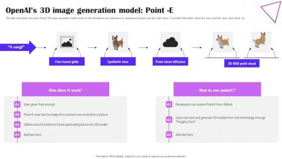 This slide showcases how does Point-E 3D image generation model works so that developers can understand its background process and give right inputs. It provides information about fine tune, synthetic view, point cloud, etc. The best PPT templates are a great way to save time, energy, and resources. Slidegeeks have 100 percent editable powerpoint slides making them incredibly versatile. With these quality presentation templates, you can create a captivating and memorable presentation by combining visually appealing slides and effectively communicating your message. Download Openais 3D Image Generation Model Point E Creative Applications For Open AI Introduction Pdf from Slidegeeks and deliver a wonderful presentation. This slide showcases how does Point-E 3D image generation model works so that developers can understand its background process and give right inputs. It provides information about fine tune, synthetic view, point cloud, etc.
