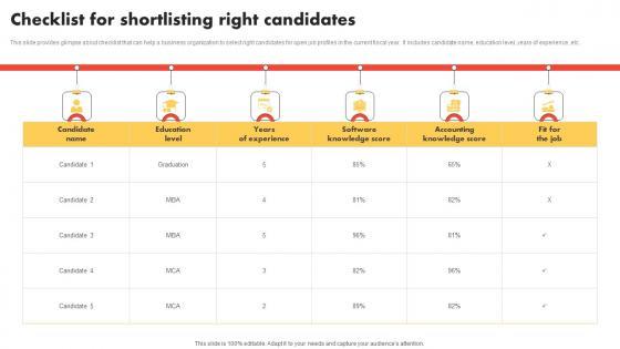 This slide provides glimpse about checklist that can help a business organization to select right candidates for open job profiles in the current fiscal year. It includes candidate name, education level, years of experience, etc. There are so many reasons you need a Checklist For Shortlisting Right Modern And Advanced HR Recruitment Infographics Pdf. The first reason is you can not spend time making everything from scratch, Thus, Slidegeeks has made presentation templates for you too. You can easily download these templates from our website easily. This slide provides glimpse about checklist that can help a business organization to select right candidates for open job profiles in the current fiscal year. It includes candidate name, education level, years of experience, etc.