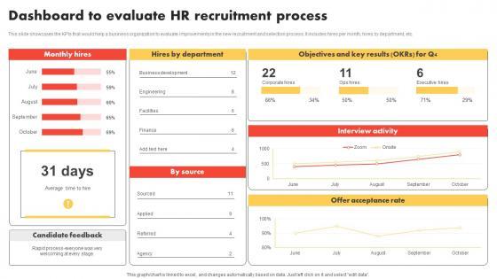 This slide showcases the KPIs that would help a business organization to evaluate improvements in the new recruitment and selection process. It includes hires per month, hires by department, etc. Get a simple yet stunning designed Dashboard To Evaluate HR Modern And Advanced HR Recruitment Template Pdf. It is the best one to establish the tone in your meetings. It is an excellent way to make your presentations highly effective. So, download this PPT today from Slidegeeks and see the positive impacts. Our easy to edit Dashboard To Evaluate HR Modern And Advanced HR Recruitment Template Pdf can be your go to option for all upcoming conferences and meetings. So, what are you waiting for Grab this template today. This slide showcases the KPIs that would help a business organization to evaluate improvements in the new recruitment and selection process. It includes hires per month, hires by department, etc.