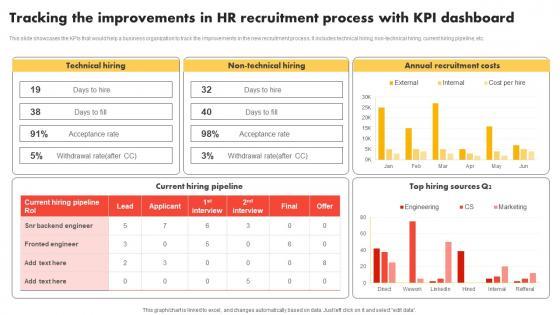 This slide showcases the KPIs that would help a business organization to track the improvements in the new recruitment process. It includes technical hiring, non technical hiring, current hiring pipeline, etc. Explore a selection of the finest Tracking The Improvements In Modern And Advanced HR Recruitment Guidelines Pdf here. With a plethora of professionally designed and pre made slide templates, you can quickly and easily find the right one for your upcoming presentation. You can use our Tracking The Improvements In Modern And Advanced HR Recruitment Guidelines Pdf to effectively convey your message to a wider audience. Slidegeeks has done a lot of research before preparing these presentation templates. The content can be personalized and the slides are highly editable. Grab templates today from Slidegeeks. This slide showcases the KPIs that would help a business organization to track the improvements in the new recruitment process. It includes technical hiring, non technical hiring, current hiring pipeline, etc.