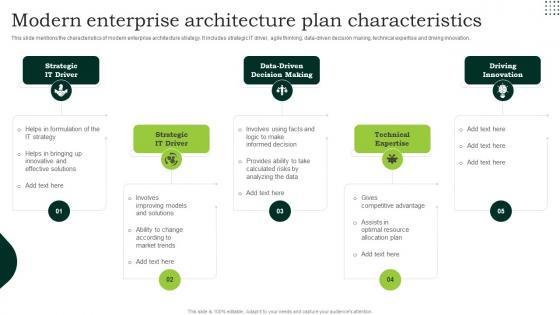 This slide mentions the characteristics of modern enterprise architecture strategy. It includes strategic IT driver, agile thinking, data driven decision making, technical expertise and driving innovation. Pitch your topic with ease and precision using this Modern Enterprise Architecture Plan Characteristics Graphics Pdf. This layout presents information on Data Driven Decision Making, Technical Expertise, Driving Innovation. It is also available for immediate download and adjustment. So, changes can be made in the color, design, graphics or any other component to create a unique layout. This slide mentions the characteristics of modern enterprise architecture strategy. It includes strategic IT driver, agile thinking, data driven decision making, technical expertise and driving innovation.