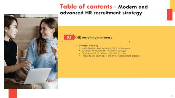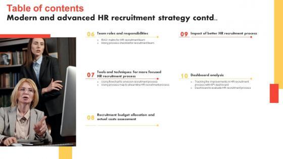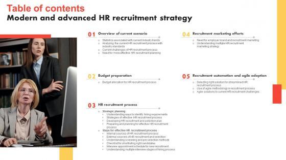 Welcome to our selection of the Table Of Contents Modern And Advanced HR Recruitment Strategy Pictures Pdf. These are designed to help you showcase your creativity and bring your sphere to life. Planning and Innovation are essential for any business that is just starting out. This collection contains the designs that you need for your everyday presentations. All of our PowerPoints are 100 percent editable, so you can customize them to suit your needs. This multi purpose template can be used in various situations. Grab these presentation templates today. Our Table Of Contents Modern And Advanced HR Recruitment Strategy Pictures Pdf are topically designed to provide an attractive backdrop to any subject. Use them to look like a presentation pro.