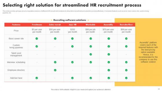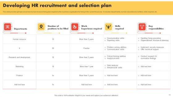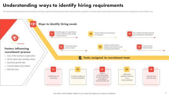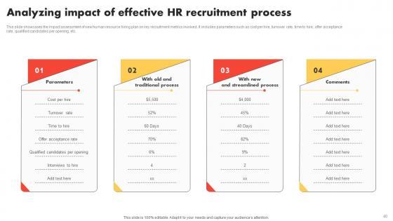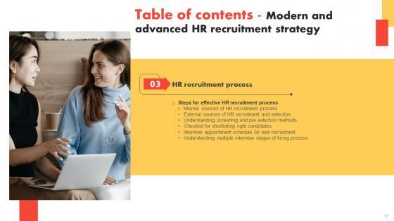 Use this Modern And Advanced HR Recruitment Strategy Ppt Powerpoint Presentation Complete Deck With Slides to ensure the business world gets to know you as a presentation expert with tremendous recall value. With its focus on providing the worlds best designs to highlight business ideas that have the potential to change the world, this PPT Template is sure to win you clients. The complete deck in Fifty two slides is a compendium of information, structured in a manner that provides the best framework for a presentation. Use this completely editable and customizable presentation to make an impact and improve your order book. Download now. Our Modern And Advanced HR Recruitment Strategy Ppt Powerpoint Presentation Complete Deck With Slides are topically designed to provide an attractive backdrop to any subject. Use them to look like a presentation pro.