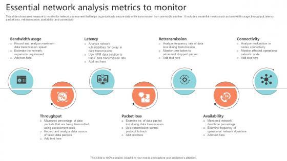 This slide showcases measure to monitor for network assessment that helps organization to secure data while transmission from one nod to another . It includes essential metrics such as bandwidth usage, throughput, latency, packet loss , retransmission, availability and connectivity.Pitch your topic with ease and precision using this Essential Network Analysis Metrics To Monitor Portrait Pdf This layout presents information on Bandwidth Usage, Retransmission, Throughput It is also available for immediate download and adjustment. So, changes can be made in the color, design, graphics or any other component to create a unique layout. This slide showcases measure to monitor for network assessment that helps organization to secure data while transmission from one nod to another . It includes essential metrics such as bandwidth usage, throughput, latency, packet loss , retransmission, availability and connectivity