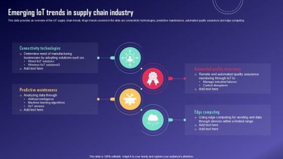 This slide provides an overview of the IoT supply chain trends. Major trends covered in the slide are connectivity technologies, predictive maintenance, automated quality assurance and edge computing . Do you have an important presentation coming up Are you looking for something that will make your presentation stand out from the rest Look no further than Emerging IoT Trends In Supply Chain IoT Fleet Monitoring Ppt Sample IoT SS V. With our professional designs, you can trust that your presentation will pop and make delivering it a smooth process. And with Slidegeeks, you can trust that your presentation will be unique and memorable. So why wait Grab Emerging IoT Trends In Supply Chain IoT Fleet Monitoring Ppt Sample IoT SS V today and make your presentation stand out from the rest This slide provides an overview of the IoT supply chain trends. Major trends covered in the slide are connectivity technologies, predictive maintenance, automated quality assurance and edge computing