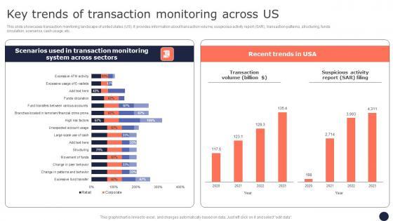 This slide showcases transaction monitoring landscape of united states US. It provides information about transaction volume, suspicious activity report SAR, transaction patterns, structuring, funds circulation, scenarios, cash usage, etc. Welcome to our selection of the Creating Transaction Monitoring Key Trends Of Transaction Monitoring Across US Mockup PDF. These are designed to help you showcase your creativity and bring your sphere to life. Planning and Innovation are essential for any business that is just starting out. This collection contains the designs that you need for your everyday presentations. All of our PowerPoints are 100 percent editable, so you can customize them to suit your needs. This multi-purpose template can be used in various situations. Grab these presentation templates today.
