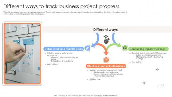 This slide showcases techniques for tracing project status. This template focuses on ensuring that team stays focused and meets deadlines. It includes information related to defining clear goals, holding constant team meetings, etc. Slidegeeks is here to make your presentations a breeze with Executing And Monitoring Project Different Ways To Track Business Project PM SS V With our easy-to-use and customizable templates, you can focus on delivering your ideas rather than worrying about formatting. With a variety of designs to choose from, you are sure to find one that suits your needs. And with animations and unique photos, illustrations, and fonts, you can make your presentation pop. So whether you are giving a sales pitch or presenting to the board, make sure to check out Slidegeeks first This slide showcases techniques for tracing project status. This template focuses on ensuring that team stays focused and meets deadlines. It includes information related to defining clear goals, holding constant team meetings, etc.