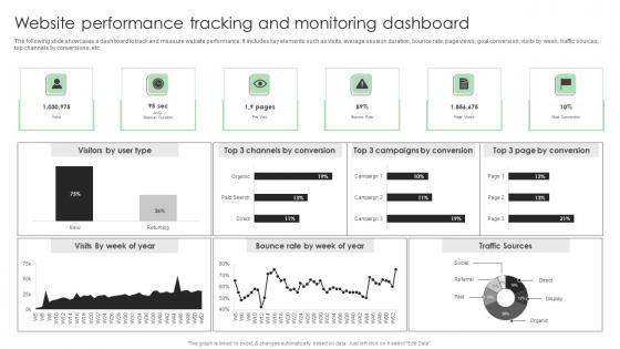 The following slide showcases a dashboard to track and measure website performance. It includes key elements such as visits, average session duration, bounce rate, page views, goal conversion, visits by week, traffic sources, top channels by conversions, etc. Explore a selection of the finest Website Performance Tracking And Monitoring Dashboard Designs PDF here. With a plethora of professionally designed and pre made slide templates, you can quickly and easily find the right one for your upcoming presentation. You can use our Website Performance Tracking And Monitoring Dashboard Designs PDF to effectively convey your message to a wider audience. Slidegeeks has done a lot of research before preparing these presentation templates. The content can be personalized and the slides are highly editable. Grab templates today from Slidegeeks.