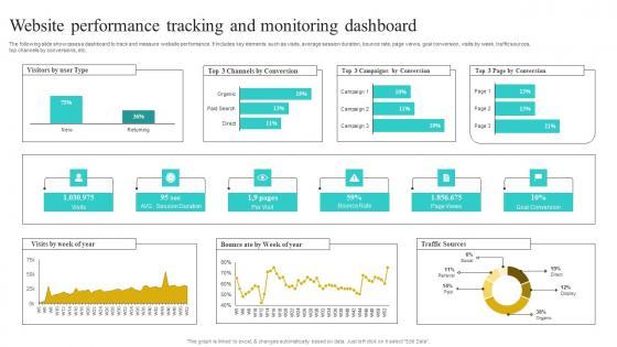 The following slide showcases a dashboard to track and measure website performance. It includes key elements such as visits, average session duration, bounce rate, page views, goal conversion, visits by week, traffic sources,top channels by conversions, etc.If your project calls for a presentation, then Slidegeeks is your go-to partner because we have professionally designed, easy-to-edit templates that are perfect for any presentation. After downloading, you can easily edit Website Performance Tracking And Monitoring Implementing Strategies To Improve Structure Pdf and make the changes accordingly. You can rearrange slides or fill them with different images. Check out all the handy templates The following slide showcases a dashboard to track and measure website performance. It includes key elements such as visits, average session duration, bounce rate, page views, goal conversion, visits by week, traffic sources,top channels by conversions, etc.